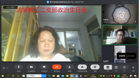 5月30日晚7点,文法学院法学系教工第二党支部通过钉钉平台,举行了一场特殊的主题党日活动,为包括滞留英国的教工党员徐英军在内的5名教工党员庆祝政治生日,并开展了两会精神学习等活动,15名正式党员全部参加。