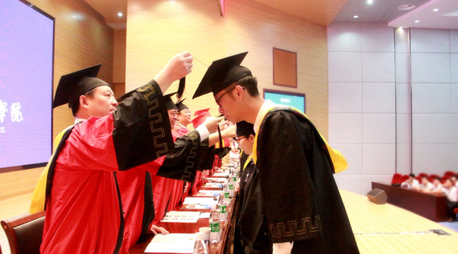 校领导为省级优秀毕业生代表扶正流苏。在喜庆欢快的气氛下,200余名毕业生代表依次上台,校领导亲切地与毕业生握手、交流,帮毕业生扶正流苏,祝贺他们获得学位。