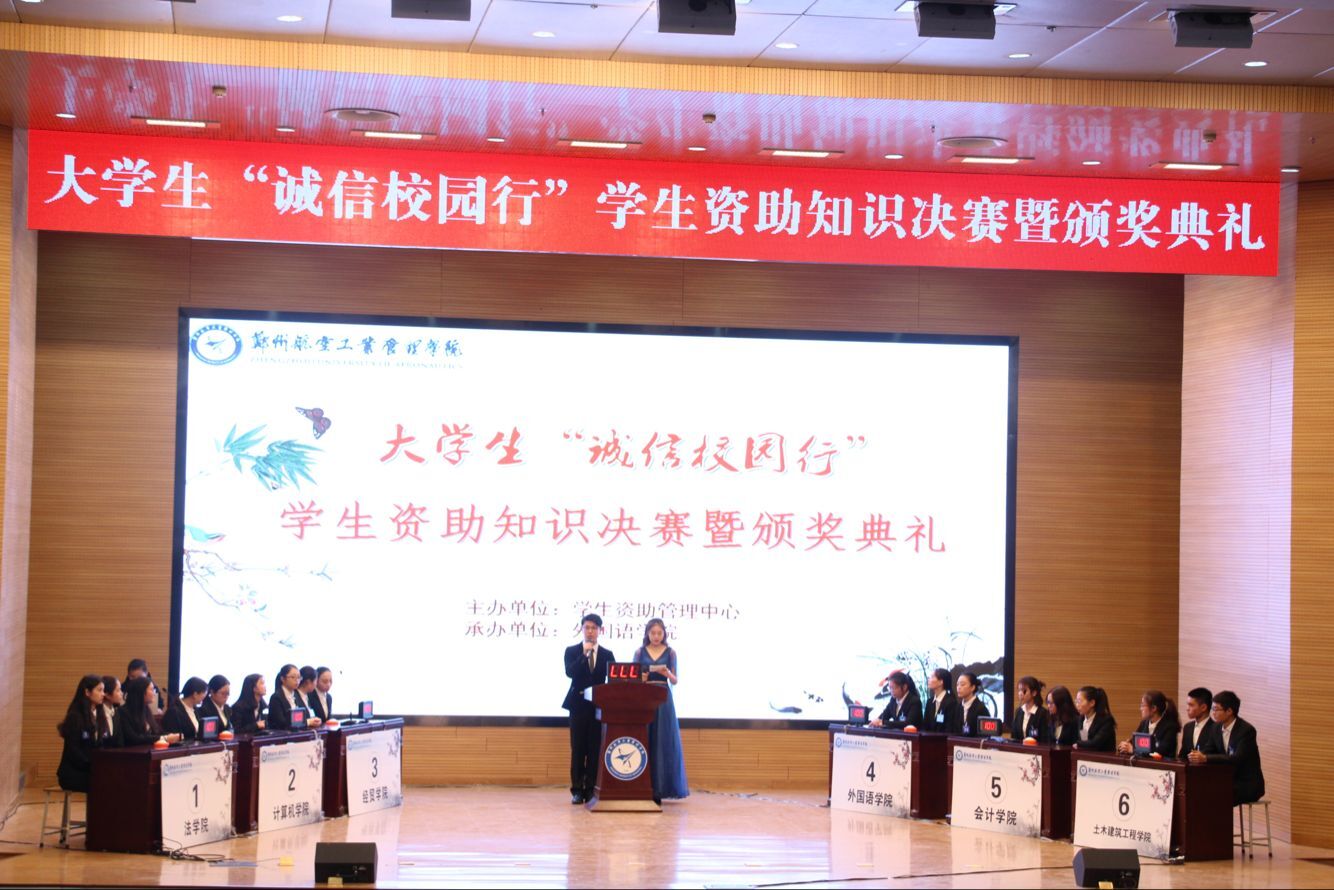 我校举行大学生“诚信校园行”学生资助知识决赛暨颁奖典礼 时间:2017年12月19日 作者:学生工作部 编辑:新闻中心 点击: 12月18日,由校学生资助管理中心主办,外国语学院承办的大学生“诚信校园行”学生资助知识决赛暨颁奖典礼在图书馆第一报告厅举行。 本次大赛于11月正式开赛,以“宣传政策 普及知识 铸就诚信”为主题, 先后经过预赛、复赛和决赛三个阶段。 决赛中,各参赛选手沉着认真,积极作答,各学院的啦啦队鼓掌助威,现场气氛十分热烈。经过一马当先(个人必答)、争分夺秒(抢答)、乘风破浪(集体必答)、乘胜追击(风险提速)等四个环节的激烈角逐,外国语学院代表队获一等奖,会计学院代表队和计算机学院代表队获二等奖,土木建筑工程学院代表队、经贸学院代表队和法学院代表队获三等奖。 据悉,河南省大学生“诚信校园行”学生资助知识大赛也将于近期举行,届时我校将从各学院代表队中选拔优秀队员代表我校参加大赛。 2017年12月19日 新闻头条 上一条:身边人感动身边人 身边事教育身边人:我校首届“感动你我 最美郑航人”颁奖典礼举行 下一条:我校在2017年度全省高校廉政文化建设征文和廉洁教育优秀案例征集评选活动中斩获多个奖项 【关闭】