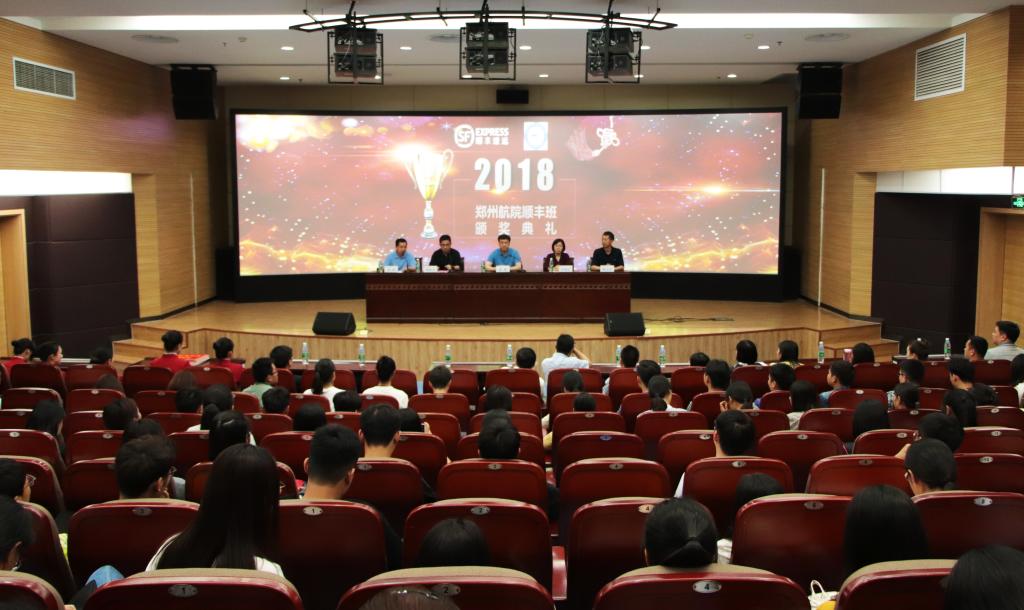 学生处处长张新红宣读《关于2018年郑州航院“顺丰奖学金”评定表彰的决定》,并由在场领导嘉宾对获得此项奖学金的学生颁奖。