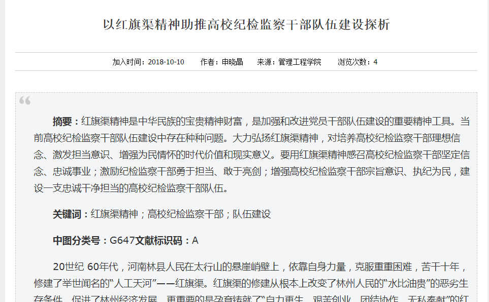 在全省高校廉政文化建设征文评选活动中,管理工程学院申晓晶的论文《以红旗渠精神助推高校纪检监察干部队伍建设探析》荣获一等奖;人文社会科学学院李达的诗歌《铁律颂》、管理工程学院王瀚梓的论文《家风对大学生廉洁教育的重要性探析》、计算机学院陈广智的论文《科研学术视阈下的高校廉政文化建设研究》荣获二等奖;党政办公室杨威的论文《廉洁教育润校园 清风高洁沐桃李》荣获三等奖。