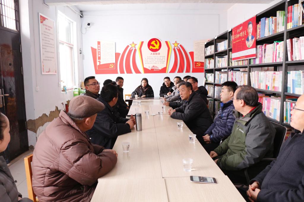 在慰问和实地考察调研后,石培哲一行与杨楼村的“两委”、驻村工作队员进行了深入座谈。杨楼村村支书时建奎、驻村第一书记钱亚军等针对村里的精准扶贫效果、帮扶项目进展,以及杨楼村下一步的发展思路和帮扶工作进行了详细汇报和深入交流。