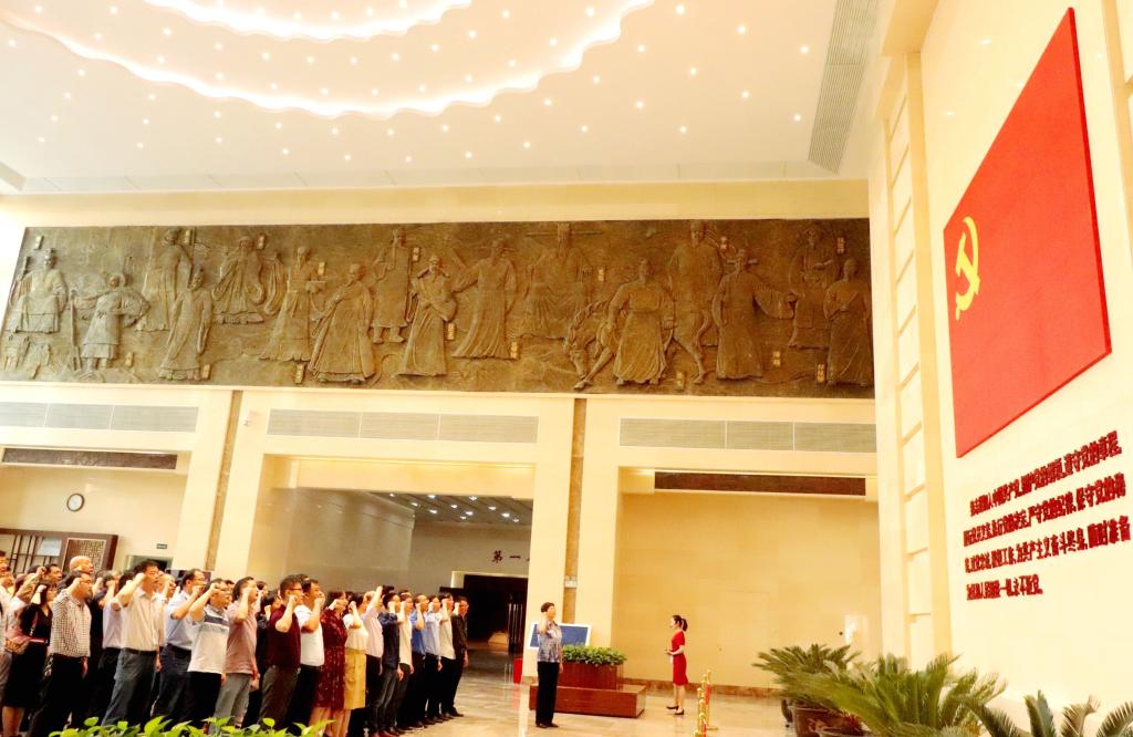 在中国共产党入党誓词展示墙前,面对鲜红的党旗,全体党员庄严肃立,纪委书记张文强领誓,重温入党誓词。
