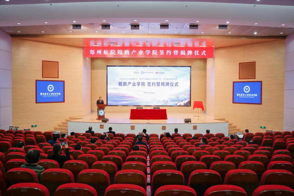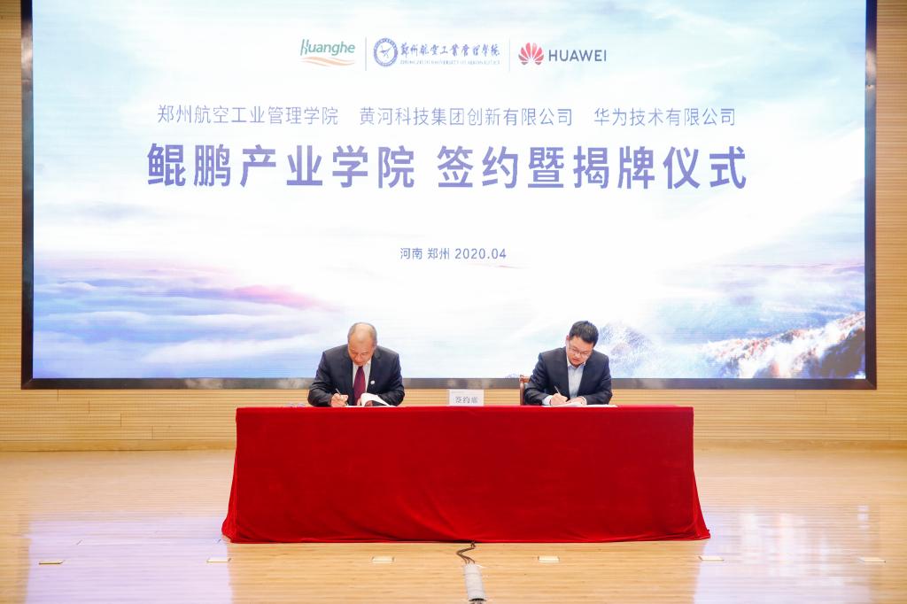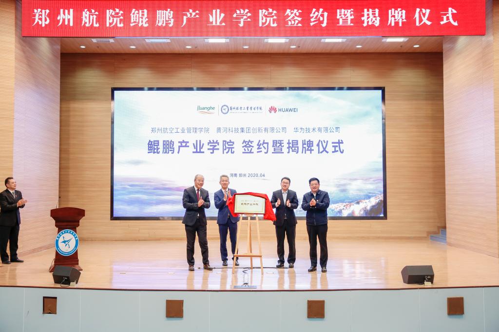 4月22日,由我校与华为技术有限公司、黄河科技集团创新有限公司共建的“郑州航院—鲲鹏产业学院”签约暨揭牌仪式在图书馆第一报告厅举行。