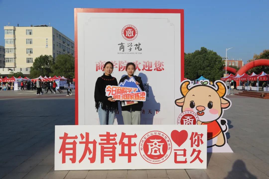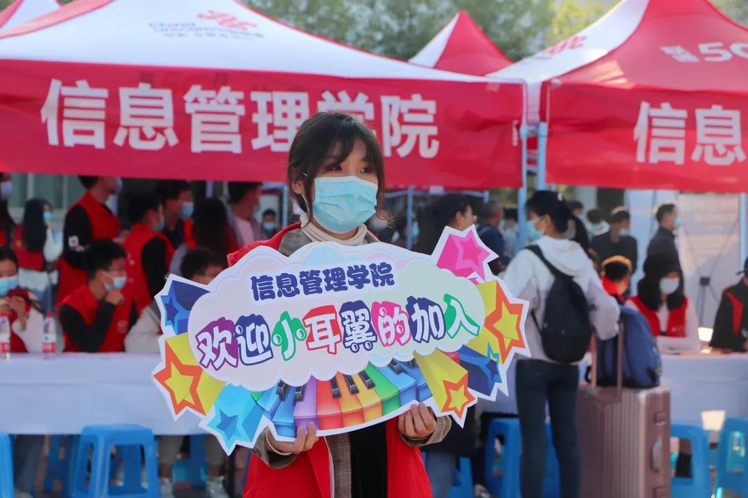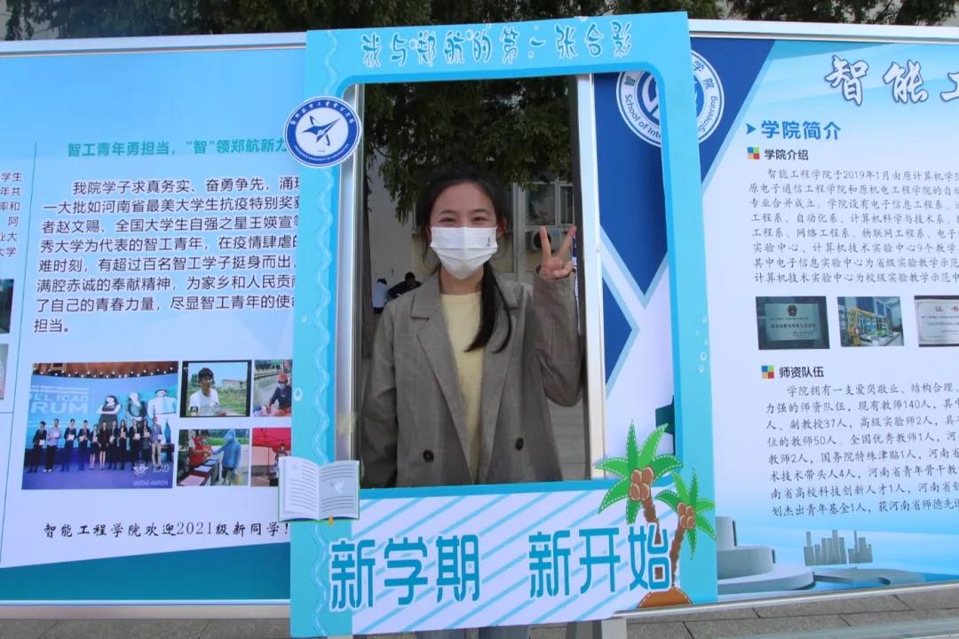在商学院的迎新展区,巨大的背景板上印着学院院徽、院训和欢迎标语,背景板前“有为青年”四个大字,吸引着新生和家长们合影留念;智能工程学院特意为新生制作了“我与郑航的第一张合影”拍照打卡框;“经济学院欢迎新同学加入我们的大家庭”红色条幅,“信息管理学院欢迎你”的定制手牌,也一一传递着他们的迎新热情。