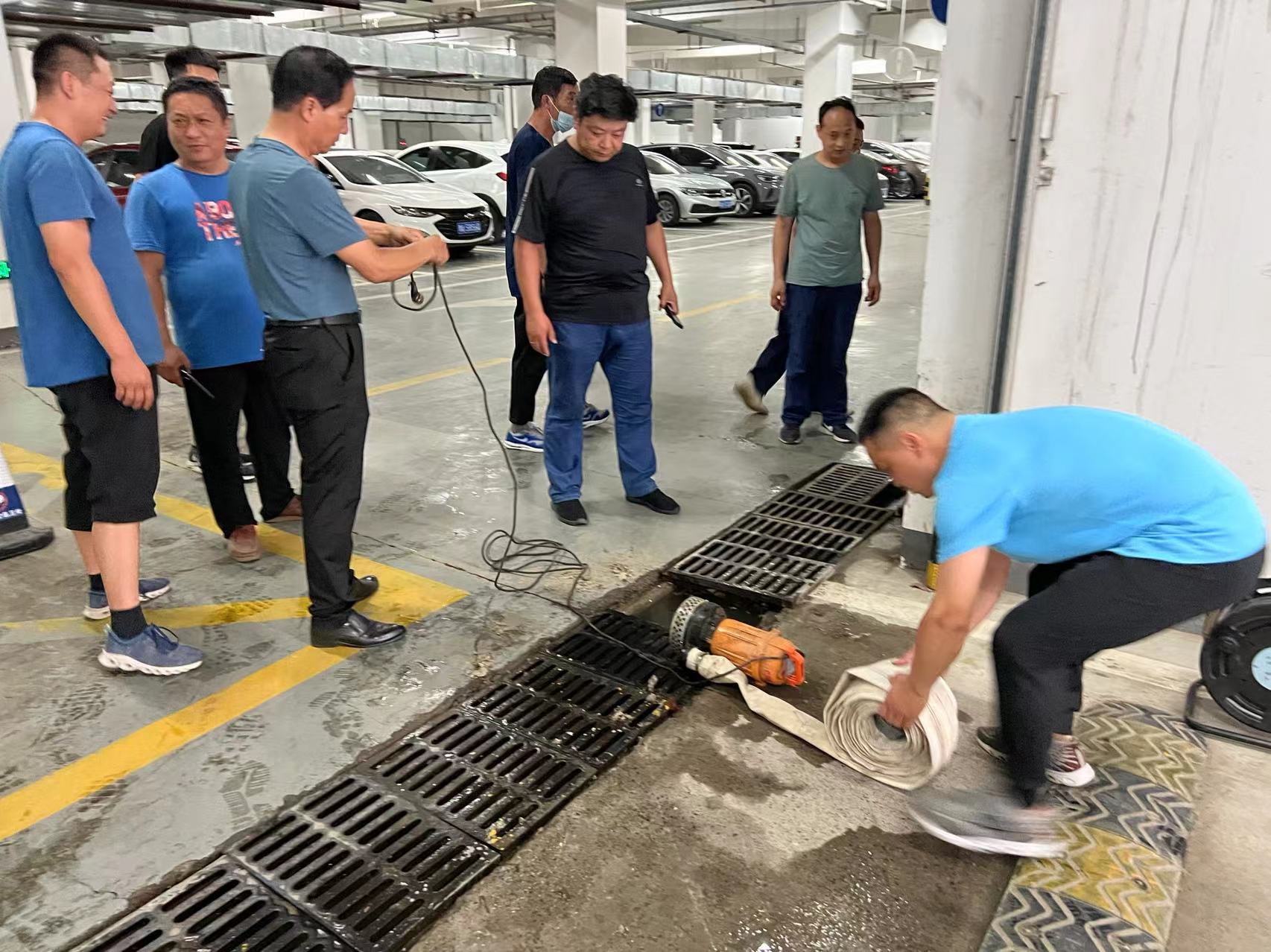 本次演练分抢险救援组、后勤保障组、治安保卫组、医疗救护组、评估组五个组。演练现场,模拟发现“综合楼附近道路严重积水,向地下停车场漫灌,情况危急”。值班人员第一时间上报,指挥长决定启动应急预案并指挥紧急抢险。抢险救援组立即安装挡水墙,放置沙袋,封堵地下停车场入口;后勤保障组放置发电机,连接水泵、水带,抽出地下停车场积水;治安保卫组维持现场秩序,协助疏散车辆、人员;医疗救护组原地待命,如有受伤人员,第一时间处置;评估组及时对演练情况进行总结,分析存在的问题和不足。演练过程紧凑有序、分工明确、反应快速、配合到位,经过近一个小时的“紧急抢险”,指挥长宣布汛情解除,防汛应急演练圆满完成。