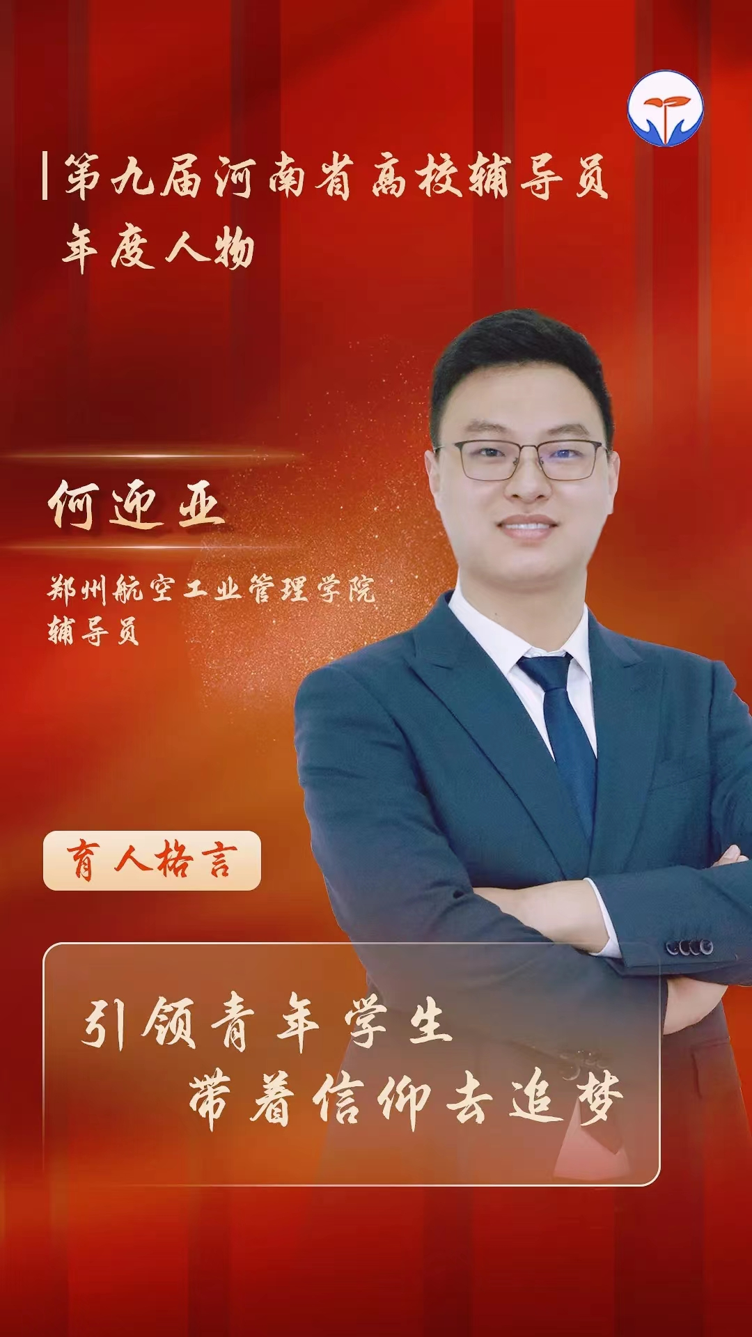 近日,中共河南省委教育工委、河南省教育厅下发了《关于公布第九届全省高校辅导员年度人物名单的通知》,我校辅导员何迎亚荣获“第九届全省高校辅导员年度人物”。