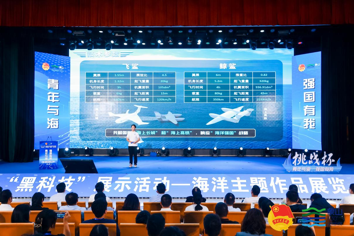 优秀项目路演阶段,《海鲨一一新型多段翼水面起降地效飞行器》设计团队与来自北京航空航天大学、浙江大学、厦门大学、青岛科技大学、哈尔滨工程大学等5支获奖团队,分别介绍项目内容,进行现场展示。