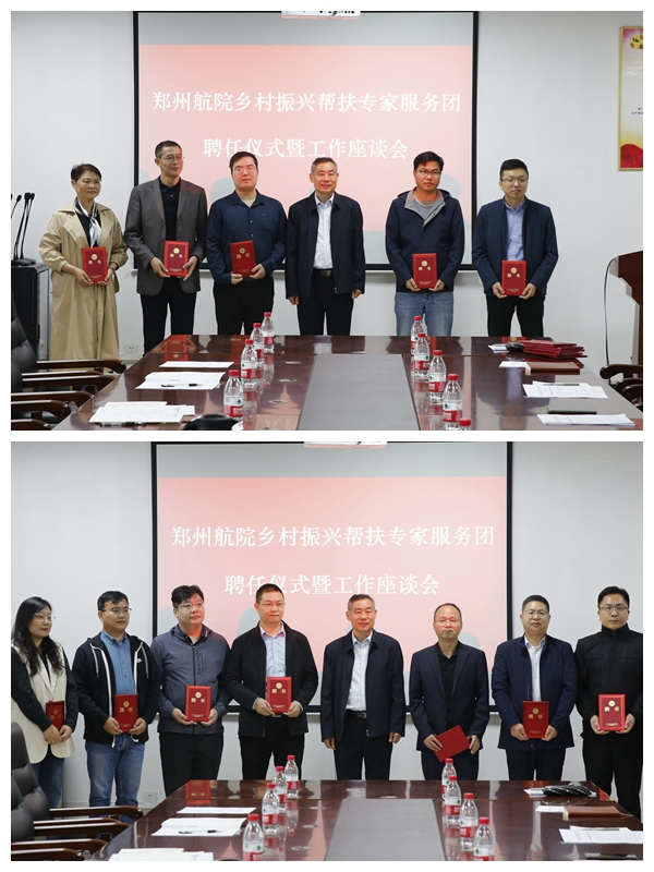 党委组织部负责人宣读《郑州航院乡村振兴帮扶专家服务团成员名单》。余传杰为专家服务团成员颁发聘书。