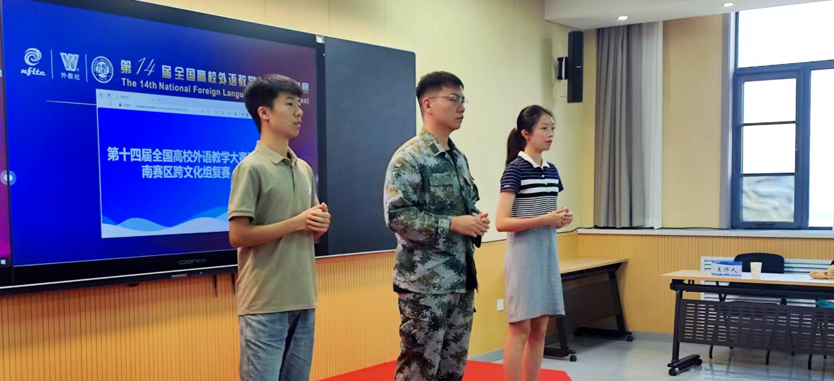 自今年5月以来,外国语学院成立跨文化教学团队,积极备赛。外国语学院指导老师从广泛搜索相关素材、撰写访谈剧本到逐字推敲剧本台词,全程跟进比赛情况,定期开展辅导。