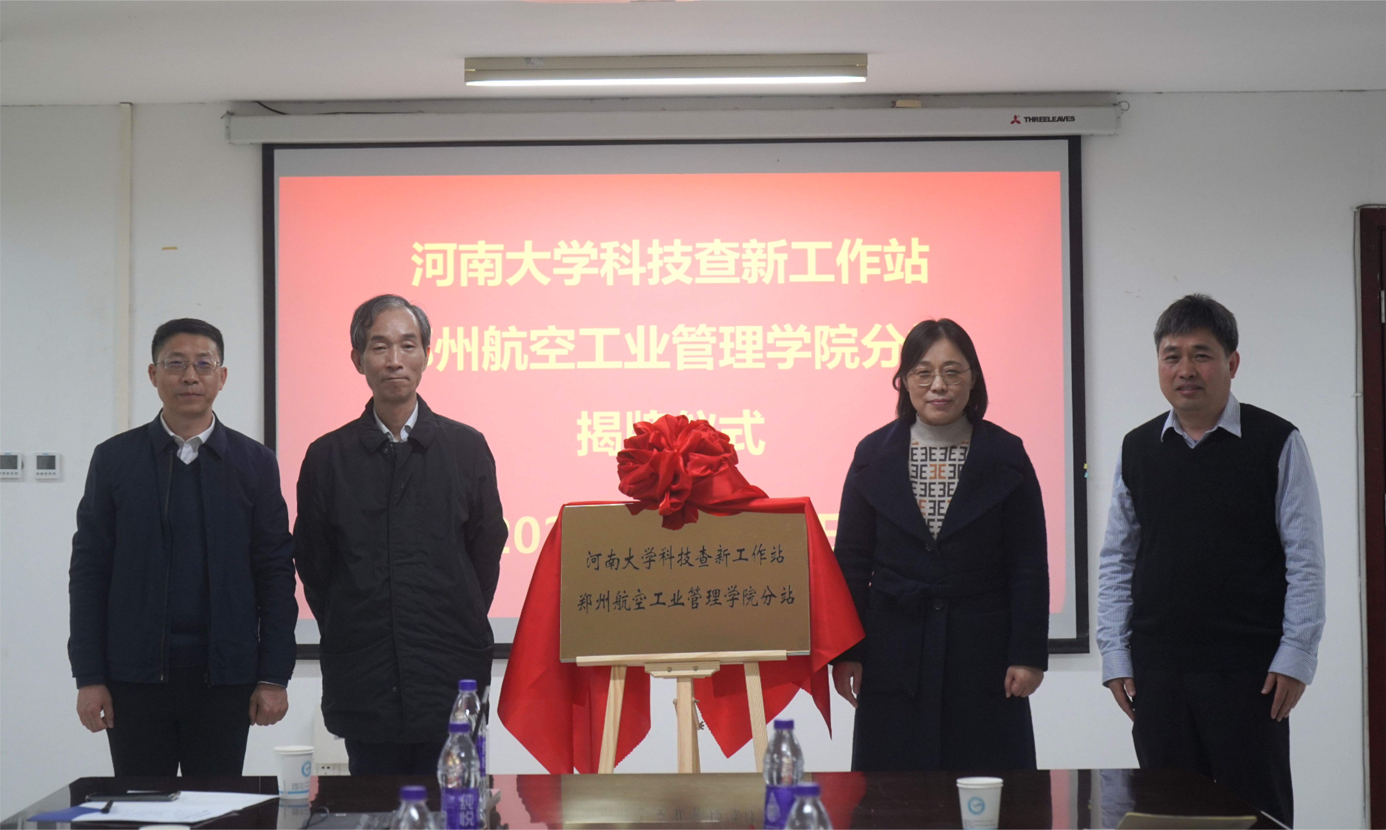 申金山、马晓静、李恒、荆立夏共同为“河南大学科技查新工作站郑州航空工业管理学院分站”揭牌。