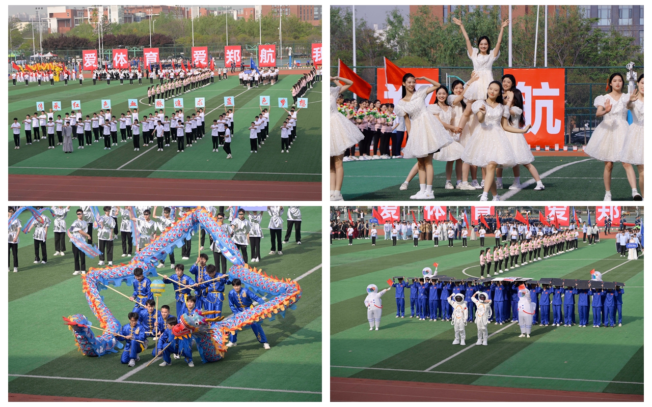 开幕式上,腰鼓队和排舞队率先登场,带来别样舞蹈《上春山》,他们踏着欢快的鼓点,意气风发、朝气蓬勃,尽显郑航学子的青春活力。来自19个学院的运动员方阵带着精心编排的节目依次登场,“火箭飞天、演绎代码编译、神龙腾云驾雾、放飞白鸽、时空对话……”他们以最饱满的精神和最美丽的姿态,为开幕式献上一场场创意十足而独具学院特色的表演。书法、水袖、折扇、舞剑彰显优秀传统文化的深厚底蕴;新中式、汉服、马面裙、俄式宫廷裙让人眼前一亮;古典优雅的鼓上舞、技惊四座的街舞、动人心弦的“红色”舞蹈轮番上阵……武术阳刚,舞蹈欢畅,传统与现代交织,中西文化碰撞。这里既是运动的盛会,又是文化交流的大舞台。当天籁般的歌声“我爱你,中国”响起,校国旗护卫队迈着整齐矫健的步伐,迎着朝阳,拥着国旗,阔步走来,万千师生肃立、齐唱国歌,高亢的国歌声激励着运动健儿们昂扬的精神斗志。