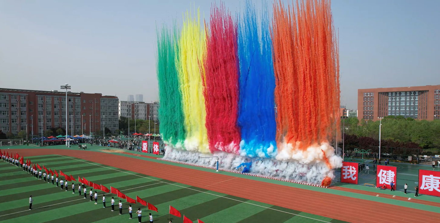刘代军宣布我校第四十一届春季运动会开幕,霎时间,五彩烟雾升腾而起,爆破声响彻云霄,宛如一面飘扬舞动的彩旗,为运动盛会送上热烈的祝福。