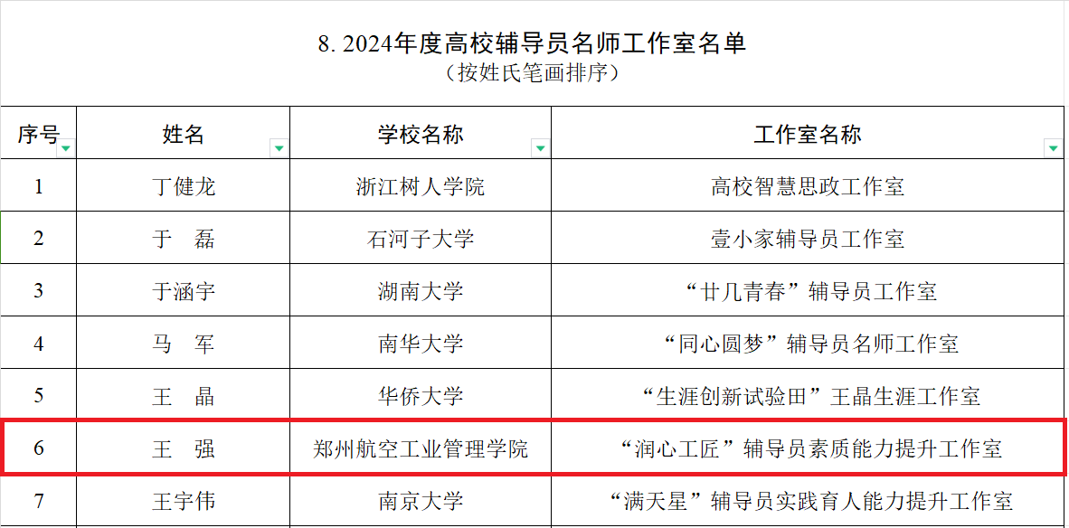 近日,教育部公布《2024年度高校思想政治工作质量提升综合改革与精品建设项目入选名单的通知》(教思政厅函〔2024〕6号),经组织推荐、资格审核、专家遴选、网络公示等环节,我校王强主持建设的“润心工匠工作室”成功入选国家级辅导员名师工作室,这是我校辅导员队伍建设及学生工作又一标志性成果。此次系教育部首次评选全国高校辅导员名师工作室(全国80项,河南省3项)。