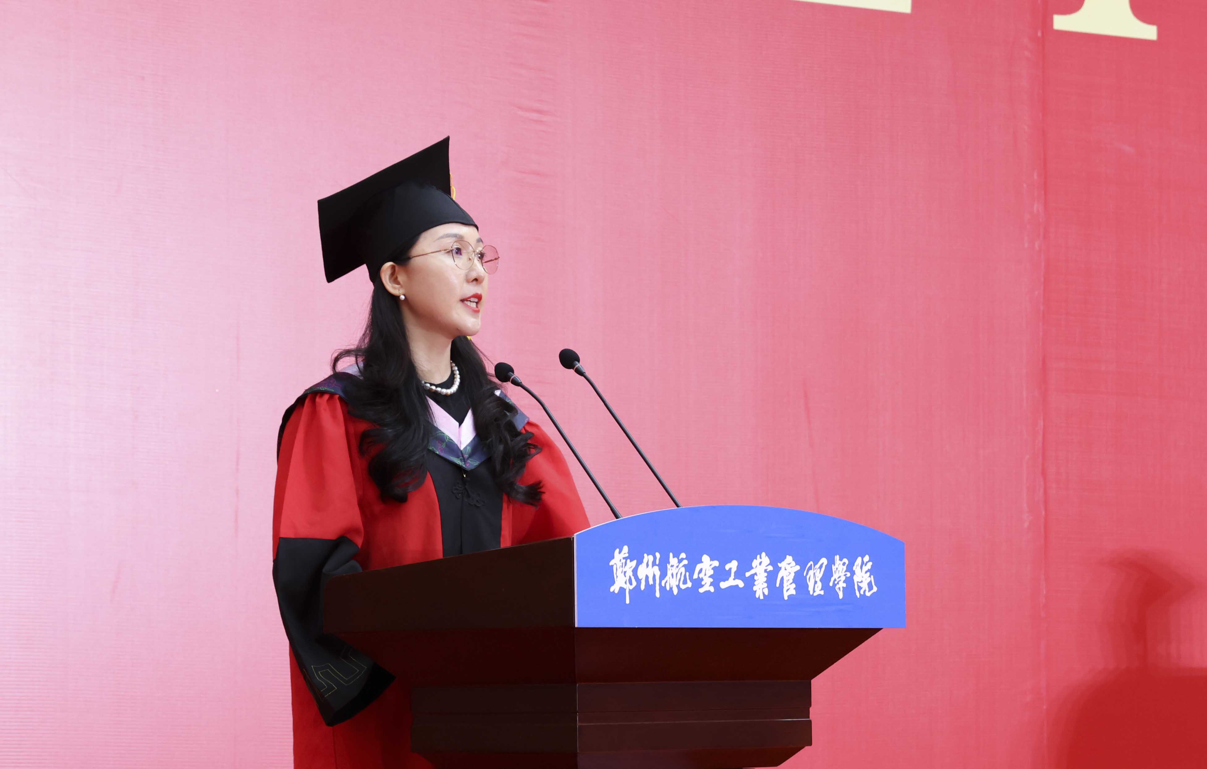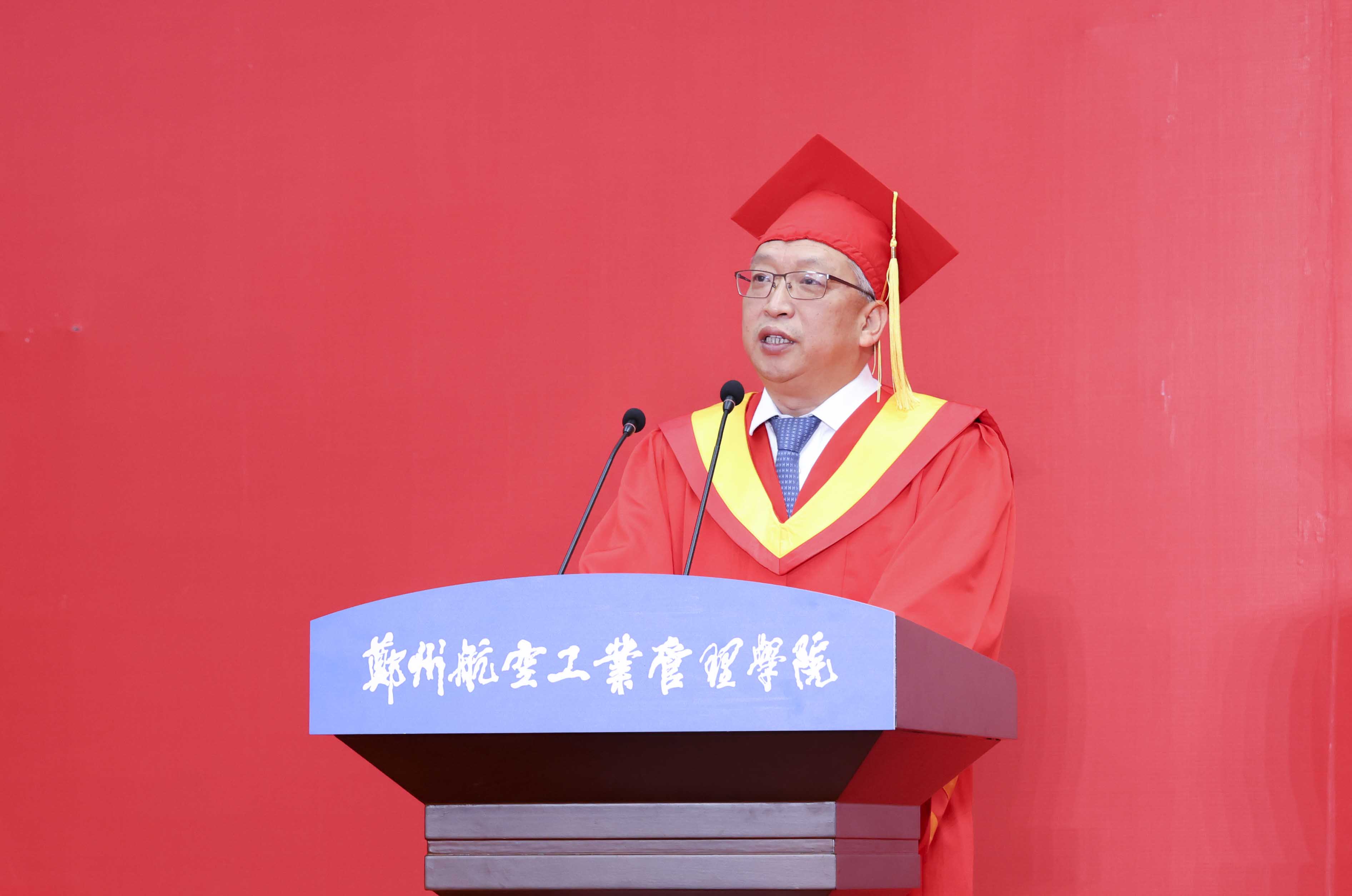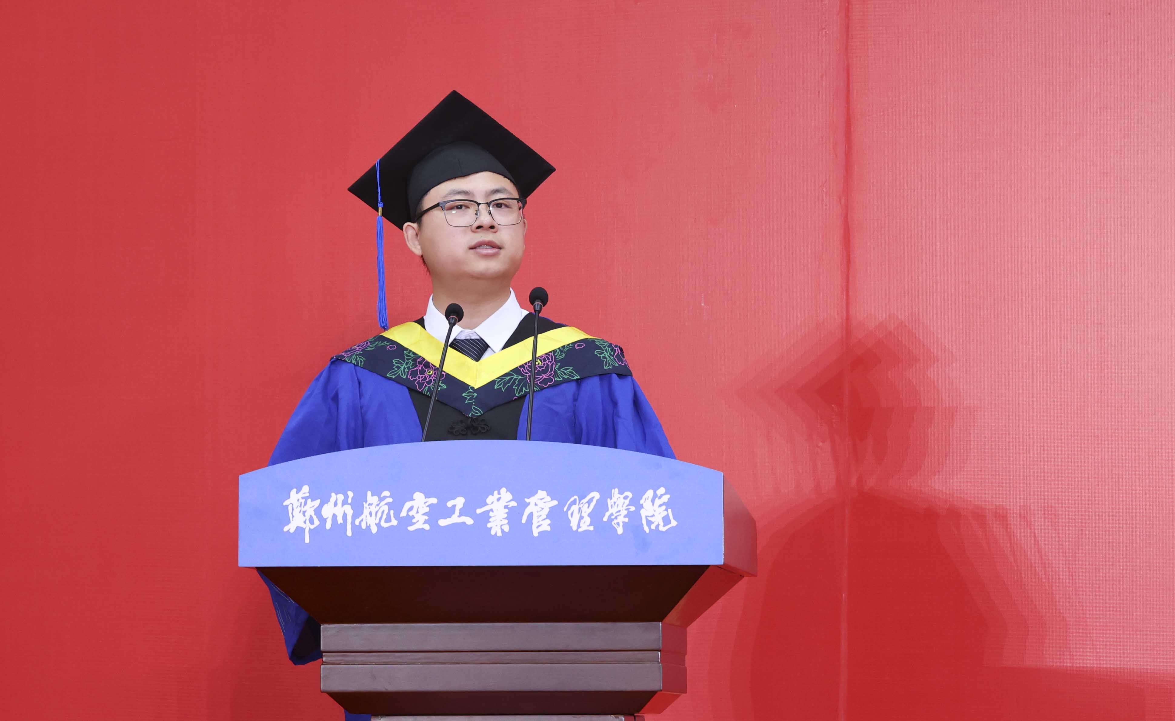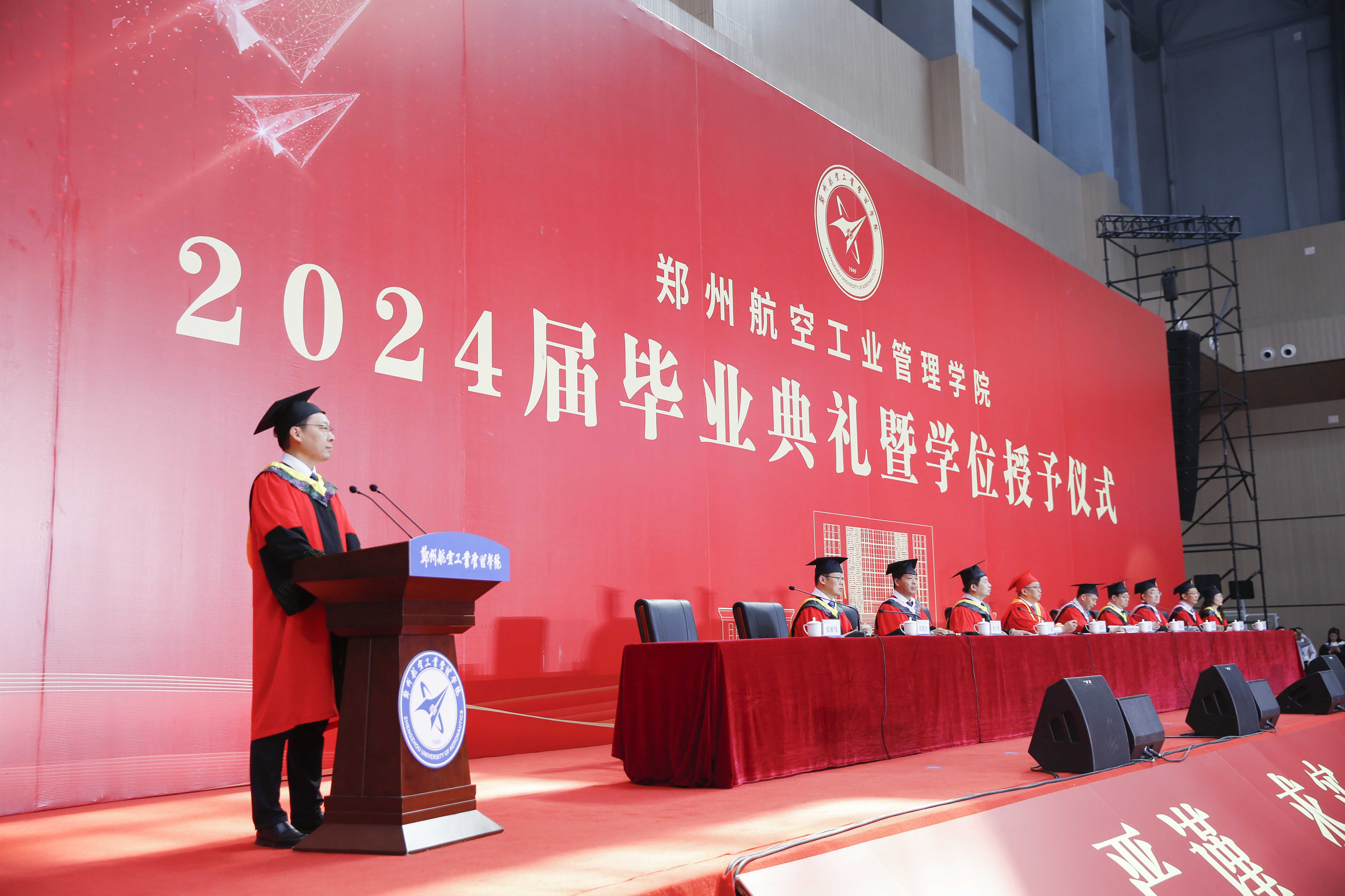 党委书记、校长刘代军发表题为《扬帆起航新征程,奋发有为建新功》的致辞,代表学校向顺利完成学业的毕业生致以热烈的祝贺,向悉心培养的老师和辛勤养育的家长表示诚挚的感谢和崇高的敬意。他指出,四年来,同学们见证了国家的繁荣发展、见证了郑航的行稳致远、见证了自己的初露锋芒,从懵懂无知的少年,成为了有思想、有追求、有担当的青年人。他希望大家能够做到“三个不负”。一是希望同学们把握时代脉搏,不负国家重托。在国家大力推动创新驱动发展战略的背景下,将个人梦想与国家发展紧密结合起来,以满腔的热情和不懈的努力,共同谱写青年一代的壮丽诗篇,为祖国的明天贡献青春力量。二是希望同学们弘扬郑航精神,不负学校厚望。郑航精神“空天报国 砺新图强”是郑航人内心深处的信念和追求,这种精神要求同学们在情怀上拥有大爱,以忠诚奉献的精神,矢志不渝地逐梦蓝天;在行动上展现担当,以脚踏实地的作风,坚持不懈的奋力拼搏。三是希望同学们树立远大理想,不负青春华章。在党的领导下,以理想者、担当者、吃苦者、奋斗者的姿态,奋进新征程,诠释新青春,创造新业绩。