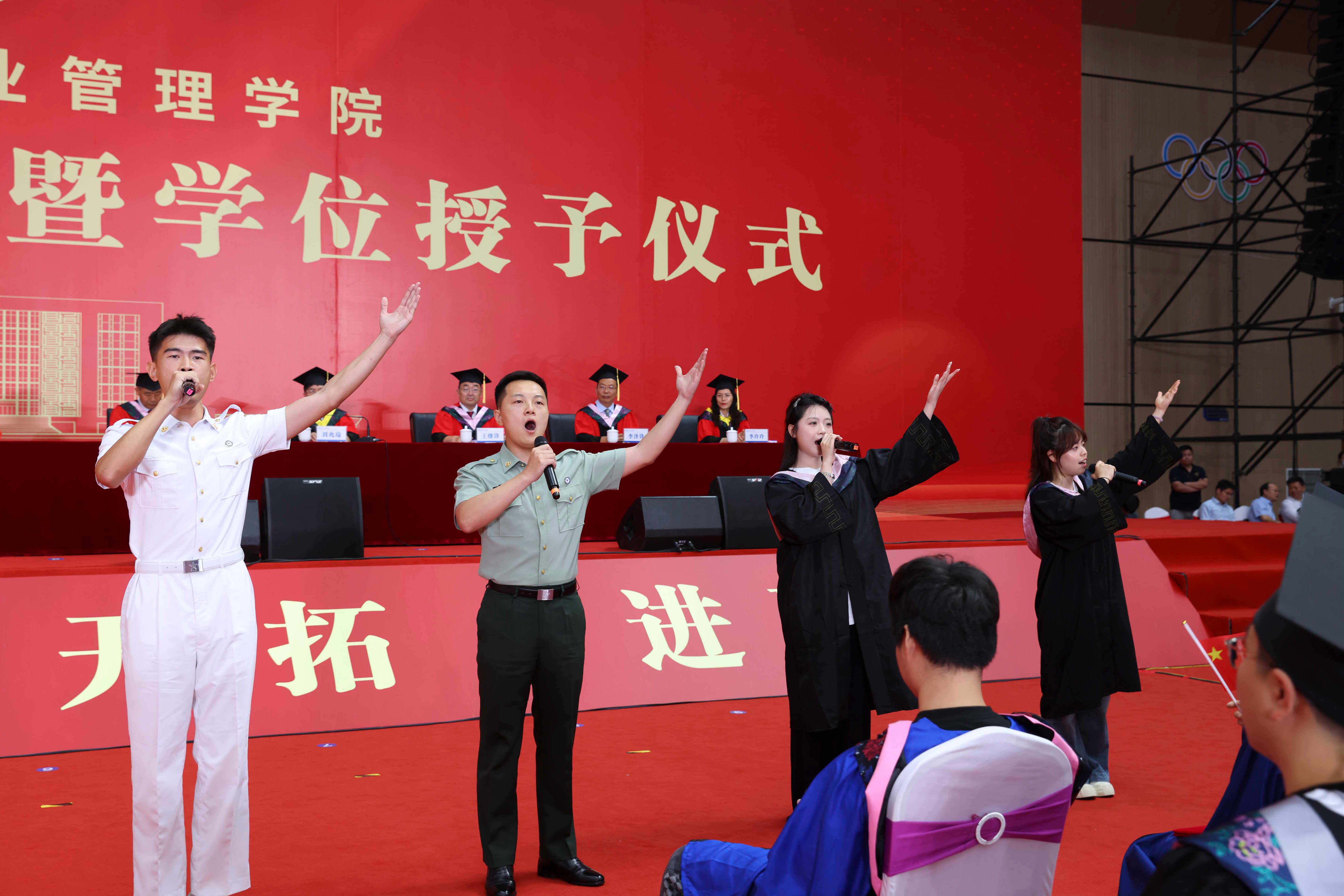 一首欢快动人的《一路生花》为典礼温情开场,在雄壮的国歌奏唱声中,毕业典礼正式开始。
