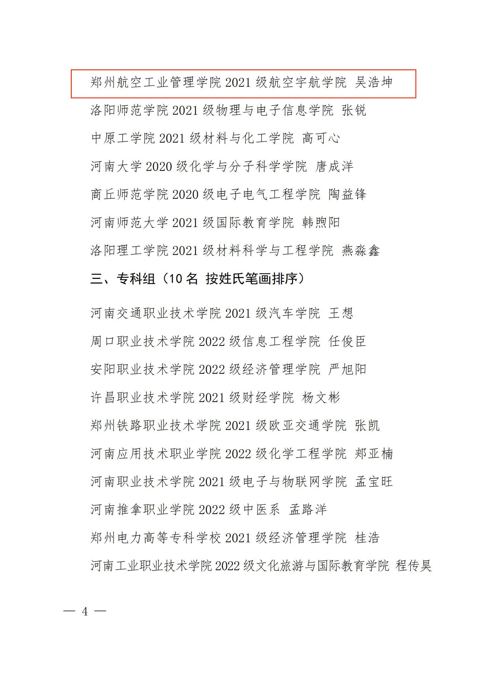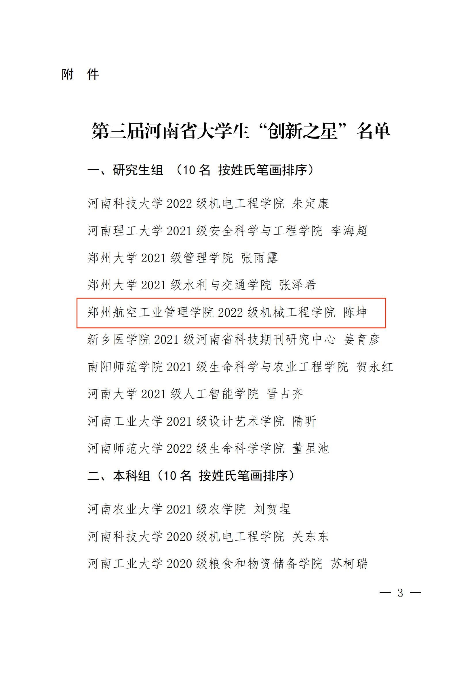 近日,河南省教育厅公布第三届河南省大学生“创新之星”名单,我校机械工程学院硕士研究生陈坤、航空宇航学院本科生吴浩坤荣获河南省大学生“创新之星”荣誉称号。