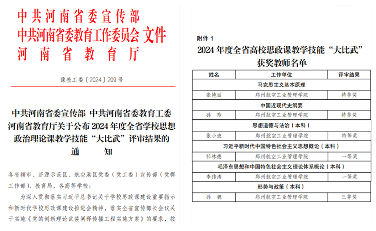 我校多名教师在全省思政课教学技能“大比武”中荣获佳绩 时间:2024年08月07日 作者:马克思主义学院 孙彤 文图 编辑:新闻中心 邓彦雯 点击: 近日,由河南省委宣传部、省委教育工委、省教育厅主办的2024年度全省学校思想政治理论课教学技能“大比武”评审结果公布,我校马克思主义学院教师张艳丽、孙玲、张小波获特等奖,祁林德、李伟涛获一等奖,孙魏获三等奖,整体获奖数量和质量位居全省高校前列。 本次思政课教学技能“大比武”活动,旨在发现和推出一批热爱教学、钻研教学、业务精湛的优秀思政课教师,引导全省学校思政课教师更加注重和创新教学方式方法,把思政课讲深讲透讲活,进一步增强思政课的针对性和吸引力。 据了解,近年来,我校高度重视思政课建设,严格落实党委主体责任,不断深化思政课改革创新,持续筑牢立德树人主阵地。学校将以此次“大比武”活动为契机,不断推进思政课建设内涵式发展取得新实效。 2024年08月07日 校内新闻 上一条:我校圆满完成2024年高招录取工作 下一条:校领导调研指导学生资助管理工作 【关闭】