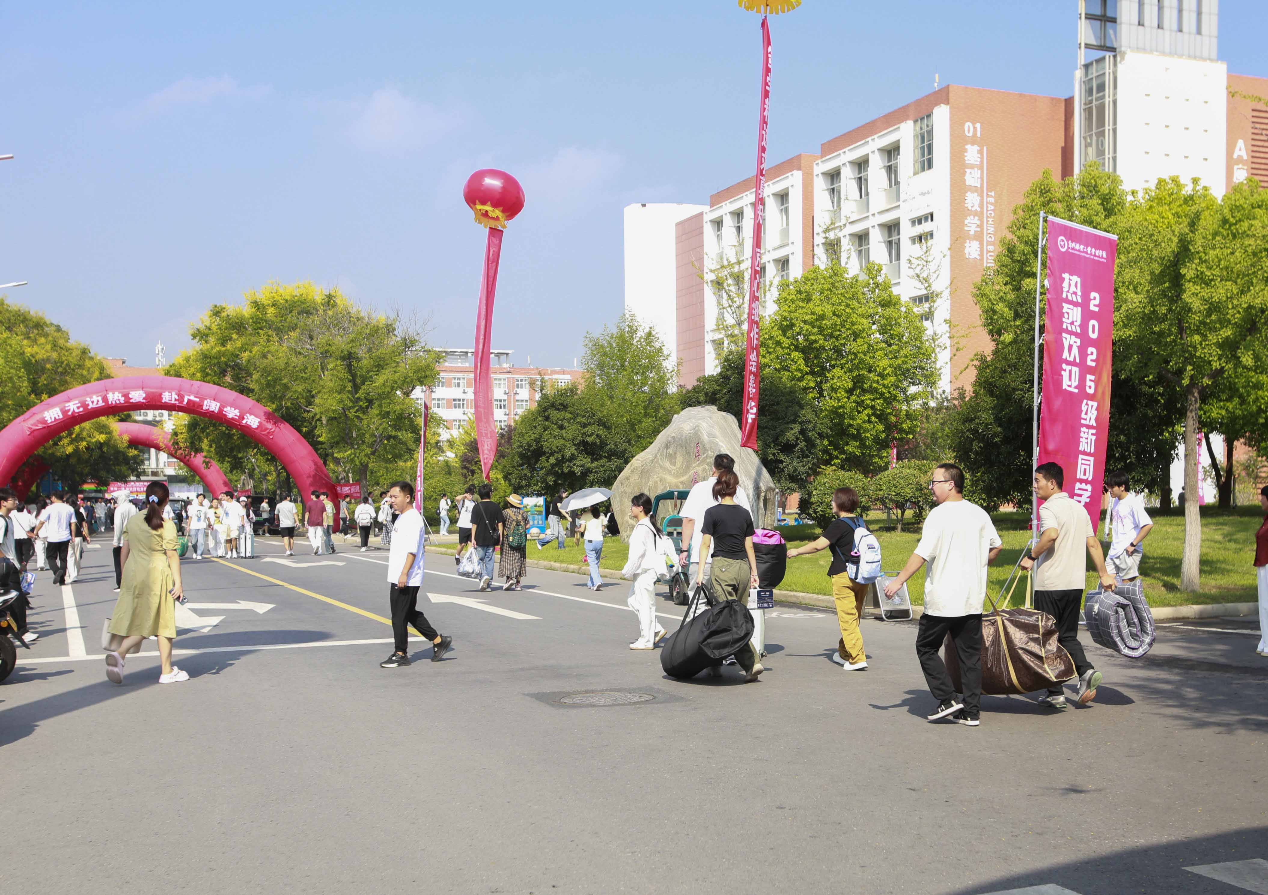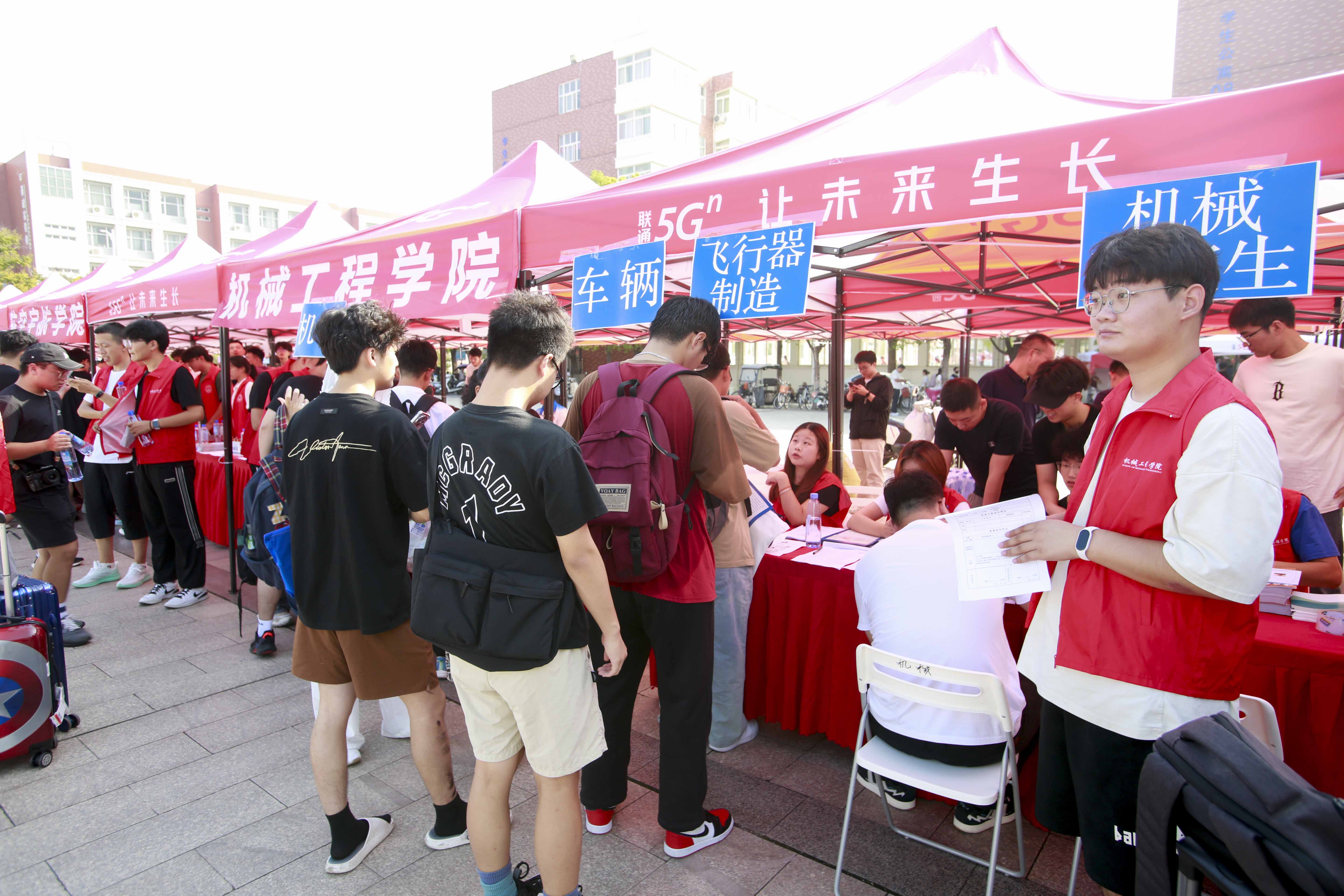 中心广场彩旗招展,“欢迎2025级新同学”的红色横幅格外醒目。由新生名字组成的“以你之名 共同启航”主题暖心墙前,许多新生拍照打卡,指尖轻触自己的名字,眼里闪着期待的光。各单位设立的“一站式”服务窗口前,工作人员认真核对信息、发放材料,整个流程高效有序。志愿者们穿梭忙碌,为新生提供报到指引、行李搬运、政策咨询等服务。