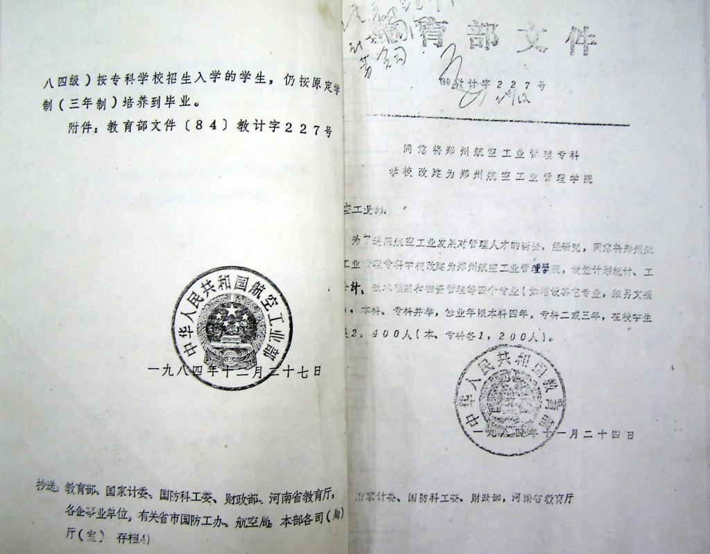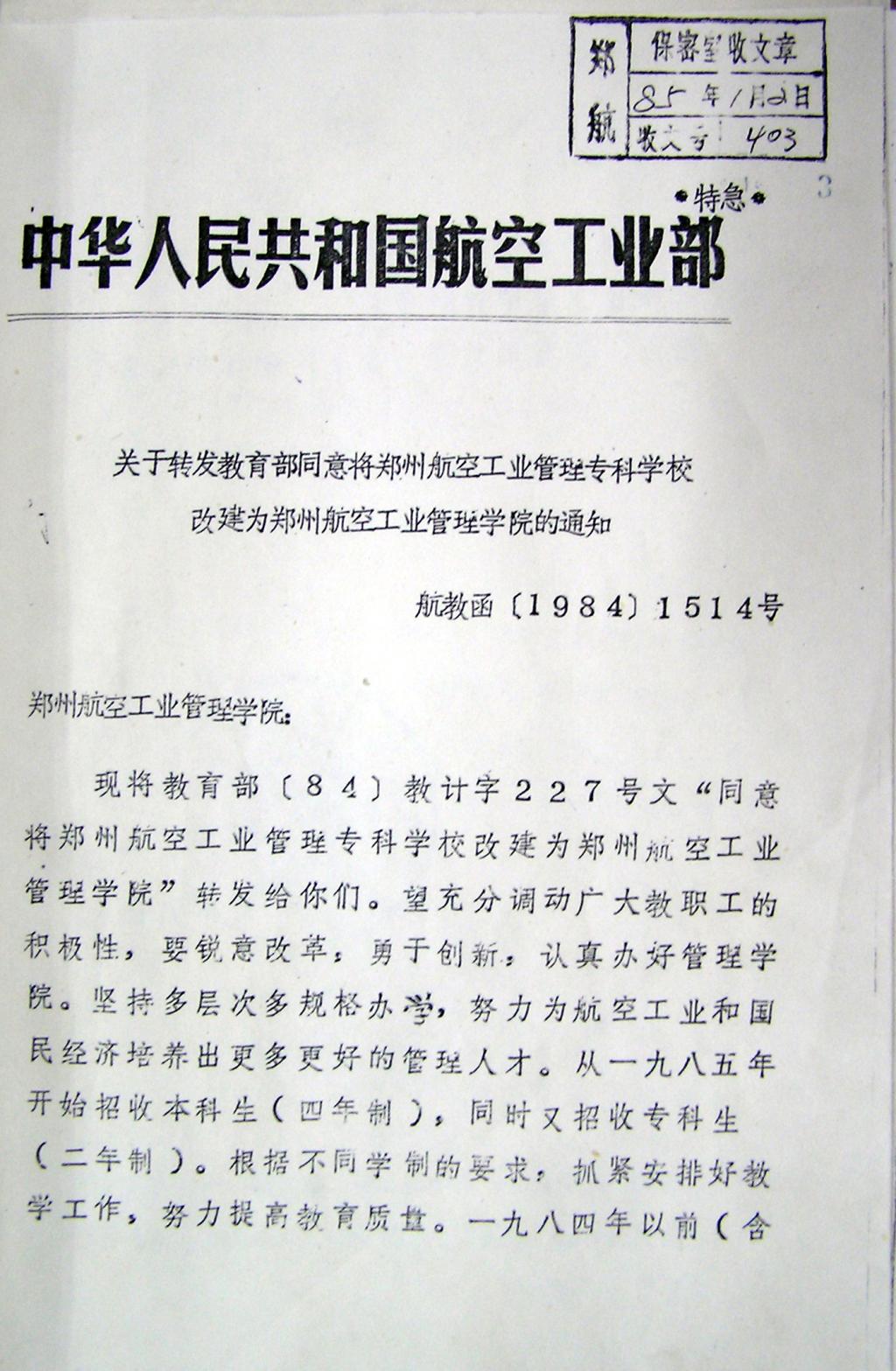 1984年11月24日,教育部教计字〔1984〕227号文件通知,将郑州航空工业管理专科学校改建为郑州航空工业管理学院。设置计划统计、工业会计、技术档案和物资管理4个专业,在校生规模2400人(本科、专科各1200人)。自此,我校正式升格为本科院校,步入新的办学历程。